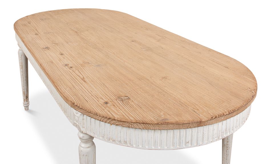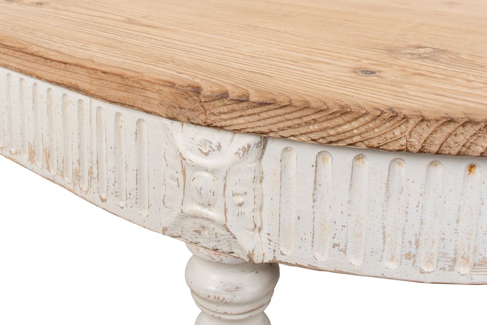 On Hand: 1 Reclaimed Pine Oval Dining Table in a Distressed White Wash Finish on the Base with Subtle Molding Details and a Natural Stained Top.